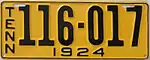 1924 | Embossed black serial on yellow plate with border line; vertical "TENN" at left and "1924" centered at bottom | 123-456 | 25-001 to approximately 205-000 | |