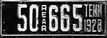 1928 | Embossed white serial on black plate with border line; vertical "FRONT" or "REAR" used as separator; "TENN 1928" at right | 123-456 | 50-001 to approximately 348-000 | |