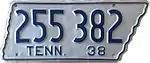 1938 | Embossed blue serial on silver state-shaped plate with border line; "TENN. 38" at bottom | 123 456 | 100 001 to approximately 443 000 | Weight classes same as 1937, but with no letter used for vehicles weighing 3,500 lb or less. |