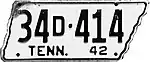 1942–43 | Embossed black serial on white state-shaped plate with border line; "TENN. 42" at bottom | 1-12345 10-1234 1D-1234 10D-123 |