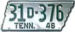 1946 | Embossed green serial on silver state-shaped plate with border line; "TENN. 46" at bottom | 1-12345 10-1234 1D-1234 10D-123 |