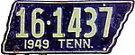 1949 | Embossed yellow serial on black state-shaped plate with border line; "1949 TENN." at bottom | 1-12345 10-1234 1D-1234 10D-123 |