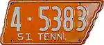 1951 | Embossed white serial on orange state-shaped plate with border line; "51 TENN." at bottom | 1-12345 10-1234 1D-1234 10D-123 |
