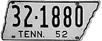 1952 | Embossed black serial on white state-shaped plate with border line; "TENN. 52" at bottom | 1-12345 10-1234 1D-1234 10D-123 |