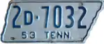 1953 | Embossed blue serial on silver state-shaped plate with border line; "53 TENN." at bottom | 1-12345 10-1234 1D-1234 10D-123 |