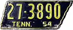 1954 | Embossed yellow serial on black state-shaped plate with border line; "TENN. 54" at bottom | 1-12345 10-1234 1D-1234 10D-123 |