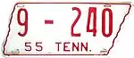 1955 | Embossed red serial on white state-shaped plate with border line; "55 TENN." at bottom | 1-12345 10-1234 1D-1234 10D-123 |