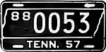 1957 | Embossed white serial within state outline on black plate with border line; "TENN. 57" centered at bottom | 1/A 1234 10/ 1234 10/A 1234 |