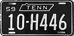 1959 | Embossed white serial on black plate with border line; "TENN" within state outline centered at top; "59" at top left | 1A-1234 10-1234 10-A123 |