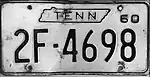 1960 | Embossed black serial on white plate with border line; "TENN" within state outline centered at top; "60" at top right | 1A-1234 10-1234 10-A123 |