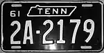 1961 | Embossed white serial on black plate with border line; "TENN" within state outline centered at top; "61" at top left | 1A-1234 10-1234 10-A123 |