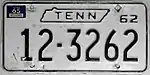 1962–65 | Embossed black serial on white plate with border line; "TENN" within state outline centered at top; "62" at top right | none | 1-1234 1A-1234 1AB-123 10-1234 10-A123 10-AB12 |