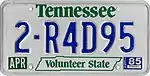 1983 – December 1987 | Embossed blue serial on reflective white plate; "Tennessee" screened in green centered at top | "Volunteer State" screened in green centered at bottom, surrounded by green state outline | 1-A1B23 1-ABC12 10-1A23 10-12A3 10-123A 10-12AB |