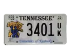 University of Kentucky | 1998 | Serial screened black on white; "TENNESSEE" screened in black at top, "University of Kentucky" screened in blue at bottom, UK/Wildcat logo screened on right, and "UK" Memorial Hall logo screened transparently in background. | U/K1234