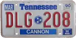 January 1988 – December 1993 | Embossed red serial on reflective white plate; blue circle with three white stars (from the state flag) screened in the center; "Tennessee" screened in blue centered at top; county name on blue sticker centered at bottom | none | ABC 123 | ABB 001 to ZZZ 999 (see right) | Serials began at DBB 001 and ran to ZZZ 999, followed by BBB 001 through CZZ 999; vowels and Y were not used until 1993, when Y and then A were used as the first letter (the last serial issued was in the APP series). |