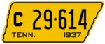 1937 | Embossed black serial on yellow state-shaped plate with border line; "TENN. 1937" at bottom | C123-456 | C30-001 to approximately C371-000 | Weight classes introduced, with C used for vehicles weighing 3,500 lb or less, and D for vehicles above 3,500 lb.[3] |