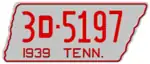 1939 | Embossed red serial on silver state-shaped plate with border line; "1939 TENN." at bottom | 1-12345 10-1234 1D-1234 10D-123 |