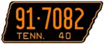 1940 | Embossed orange serial on black state-shaped plate with border line; "TENN. 40" at bottom | 1-12345 10-1234 1D-1234 10D-123 |