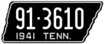 1941 | Embossed white serial on black state-shaped plate with border line; "1941 TENN." at bottom | 1-12345 10-1234 1D-1234 10D-123 |