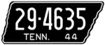 1944 | Embossed white serial on black state-shaped plate with border line; "TENN. 44" at bottom | 1-12345 10-1234 1D-1234 10D-123 |