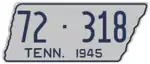 1945 | Embossed blue serial on silver state-shaped plate with border line; "TENN. 1945" at bottom | 1-12345 10-1234 1D-1234 10D-123 |