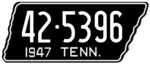1947 | Embossed white serial on black state-shaped plate with border line; "1947 TENN." at bottom | 1-12345 10-1234 1D-1234 10D-123 |
