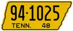 1948 | Embossed black serial on yellow state-shaped plate with border line; "TENN. 48" at bottom | 1-12345 10-1234 1D-1234 10D-123 |