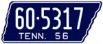 1956 | Embossed white serial on dark blue state-shaped plate with border line; "TENN. 56" at bottom | 1-12345 10-1234 1D-1234 10D-123 |