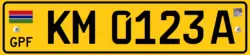 52 cm x 11 cm Black on yellow Gambian Flag as well as the text GPF on the top left corner of the license plate |