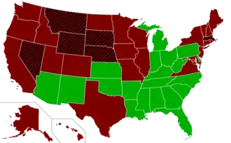 In Nevada, all motor vehicles, with the exception of motorcycles and trailers, are issued two license plates. According to state law, most standard passenger vehicles issued two plates are required to display them on both the front and rear bumpers of the vehicle. Display of the front license plate, however, is optional for vehicles that either were not designed to have a front plate, or the manufacturer did not provide a plate bracket or other means for front display of a license plate.[38] As a result, the law to display both the front and rear plates is rarely enforced, and it is not uncommon for owners of vehicles with Nevada license plates to remove the manufacturer-supplied front license plate brackets from their vehicles and display only the rear plate.[39] In 2015, the Wyoming State Legislature amended state law, similar to Nevada, to remove the requirement that a front license plate be displayed on vehicles that either are not specifically designed to have a front plate, or the manufacturer did not provide a plate bracket or other means for front display of a license plate.[40] The Nebraska Legislature amended state law in a similar manner in 2016.[41] In 2017, the Montana State Legislature also amended state law in a similar manner, exempting such passenger vehicles from displaying a front plate but requiring motorists to first obtain approval from the Montana Highway Patrol.[42]