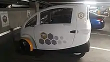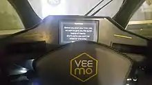 The Veemo is a single person, pedal-electric (Pedelec) hybrid vehicle which is regulated as an electric bicycle to a top speed of 32 km/h (20 mph) and power limit of 500 watts in Canada.[9] The second generation vehicle weighs 62 kg and is capable of climbing hills of up to a 20% grade.[10] It is semi-enclosed and has sufficient storage space to hold a full-sized overhead baggage suitcase. The internal battery is replenished through battery swapping.[11]