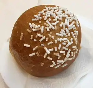 Veneziana is a sweet of the lombard cuisine covered with sugar grains or almond icing.[1] It is served in two versions: the bigger one is consumed during Christmas,[2] like panettone, the smaller one is eaten as breakfast, along with cappuccino, like croissants. Veneziana is butter and flour-based and uses sourdough as leavening;[3] the smaller version is usually plain, sometimes filled with custard, while the bigger version contains candied orange.