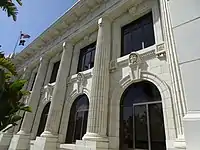Notable design features of the facade include white glazed terra cotta panels and decorations, including 24 whimsical faces of Franciscan friars, fluted Doric columns, a copper-sheathed dome and cupola, Roman-arched windows, and ornate brass gates and double doors. The interior design features include extensive use of Italian marble, bronze balustrades, and a large, second-floor courtroom (now city council chambers) with carved mahogany woodwork, three domes with leaded, stained glass skylights, and arched windows overlooking the city and ocean.[8][4][3]