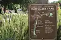 The southern end of the trail, known as the Ventura River Trail, follows the east side of the Ojai Freeway about 3 mi (4.8 km) through the industrialized Ventura Oil Field before crossing under the freeway adjacent to Crooked Palm Road.[1] The trail then follows the west side of highway 33 another 3 mi (4.8 km) through the former Canet oil refinery and the Ventura water purification plant to Foster Park at the south edge of Casitas Springs.[2] The trail known as the Ojai Valley Trail diverges from the highway along the west side of Casitas Springs into riparian woodlands following the east bank of the Ventura River as the highway climbs to Oak View. From 2 mi (3.2 km) of two percent uphill grade, the trail emerges from the woodlands along the west side of Oak View to rejoin the highway from a high fill across Devils Gulch overlooking the river. The trail closely follows the west side of highway 33 north of Oak View about 4 mi (6.4 km) until crossing the highway at the intersection with California State Route 150 into downtown Ojai. The northern end of the trail runs more than a mile easterly from the intersection through Ojai a few blocks south of highway 150.[3]