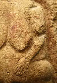The figure holds a bison horn, or possibly a cornucopia, in one hand, which has thirteen notches. She has large breasts, a great stomach, and wide hips. There is a "Y" on her thigh and her faceless head is turned toward the horn. The lower relief was covered in red ochre.[1]
