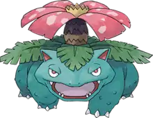 Venusaur has received positive reception. Complex's Elijah Watson commented, "most of us grew up" with Venusaur.[16] GamesRadar editor Brett Elston commented that Venusaur "sets the standard for evolutions" - namely that a Pokémon will start off "cute", and then become an "unsightly beast".[17] He noted, however, that while "ugly", Venusaur is also "intimidating".[18] GamesRadar noted Venusaur as Bulbasaur's "greatest drawback", due to its lack of charm.[19] GamesRadar's Carolyn Gudmundson called it one of her "favourite" Pokémon due to it being "ugly" and resembling a cat. Another editor commented that the way its teeth stick resembles the manga cliche of a cat design, while yet another editor commented that he liked the way how Bulbasaur's flower bloomed as it grows into Ivysaur and then Venusaur.[20] Kevin Slackie of Paste listed Venusaur as 21st of the best Pokémon.[21] IGN's Pokémon Chick wrote that since Red and Blue, the Pokémon Charizard had "slightly surpassed Venusaur in terms of popularity".[22] In a poll conducted by IGN, it was voted as the "15th best" Pokémon; IGN staff felt that Venusaur paled in comparison to Charizard and Blastoise due to them being more intimidating.[23] Author Daniel Bischoff chose to not evolve Bulbasaur into Venusaur and stated that Venusaur "just looked kind of fat."[24] Series artist Ken Sugimori noted that Venusaur, while one of his favorite Pokémon, was his least favourite Pokémon to draw due to its complex design.[25] Official Nintendo Magazine's Elizabeth Mo included it on her list of Pokémon she wants to see given a Mega Evolution.[26] Destructoid's Steven Hansen felt that Venusaur's Mega Evolution looked "stupid."[27] An artist RJ Palmer of the film Detective Pikachu made a hyper-realistic Venusaur, it was too scary that Venusaur was only put on the background.[28] Ben Skipper of the International Business Times praised the designs of Venosaur in Pokémon Green.[29]