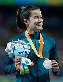 That year she was selected to represent Brazil at the 2013 IPC Athletics World Championships. There she competed in three events, the 100 m and 200 m T38 sprints and the long jump T37/38. In the long jump she finished sixth, but she medalled in both the 100 m (silver) and the 200 m (gold).[2] The following year she participated in the 2014 Para-South American Games in Santiago where she won gold in the 100 m, 200 m and long jump events.[3]