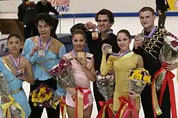 In June 2011, it was reported that Bazarova/Larionov would move along with their coach, Ludmila Kalinina, from Perm to Saransk.[5][14] Bazarova said they were comfortable in Saransk, also the host of the 2011 and 2012 Russian national championships.[15] The pair's first event of the 2011–2012 season was Nebelhorn Trophy, where they won silver. They were 5th at 2011 Skate America, their first Grand Prix event of the season. At 2011 Trophée Eric Bompard, they won the silver medal with a new personal best in the free program. Bazarova/Larionov won their first national title at the 2012 Russian Championships. At the 2012 European Championships, they set new personal bests in their short and long programs. They scored a total of 193.79 points overall and won the silver medal. They finished 6th at the 2012 World Championships. Bazarova/Larionov were assigned to represent Team Russia at the 2012 World Team Trophy. They placed first in the pairs event.
