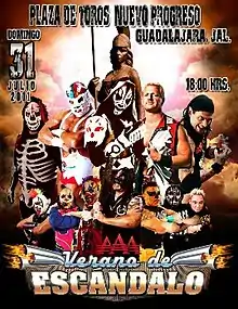 First held during the summer of 1997 the Mexican professional wrestling, company AAA began holding a major wrestling show during the summer, most often in September, called Verano de Escándalo ("Summer of Scandal").[5] The Verano de Escándalo show was an annual event from 1997 until 2011, then AAA did not hold a show in 2012 and 2013 before bringing the show back in 2014, but this time in June, putting it at the time AAA previously held their Triplemanía show.[6] In 2012 and 2013 Triplemanía XX and Triplemanía XXI was held in August instead of the early summer.[7] The show often features championship matches or Lucha de Apuestas or bet matches where the competitors risked their wrestling mask or hair on the outcome of the match. In Lucha Libre the Lucha de Apuetas match is considered more prestigious than a championship match and a lot of the major shows feature one or more Apuesta matches. The 2011 Verano de Escándalo show was the 15th show in the series.