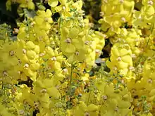 Verbascum dumulosum, the shrubby mullein, is a species of flowering plant in the family Scrophulariaceae, native to south west Turkey. Growing to 25 cm (10 in) tall by 40 cm (16 in) wide, it is an evergreen subshrub with sage-like, felted grey-green leaves and masses of saucer-shaped yellow flowers with red eyes in summer. As it requires sharp drainage, it is often planted in full sun in a gravel bed or in rock crevices.[2][3]
