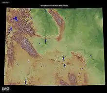 Relief map of Wyoming. The Vérendryes reached either the Big Horn Mountains, the Laramie Mountains or the Black Hills. The Big Horns are in the north Center. To the west is the Big Horn Basin and then the Yellowstone country. The Laramies are a projection of the Colorado Rockies on the south. The North Platte is barely visible north of the Laramies. The Black Hills are just east of the map.