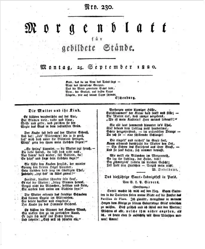 - Morgenblatt für gebildete Stände, 14 (230): p. 921, 25 September 1820