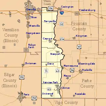 There are seven incorporated towns in Vermillion County. Cayuga is located near the confluence of the Vermillion and Wabash rivers, along State Road 63 just west of its intersection with State Road 234. Clinton is the largest settlement in the county with a population of about 5100, and lies further to the south along the Wabash River, between it and State Road 63; State Road 163 passes through the town to reach U.S. Route 41 on the east side of the river. Fairview Park is just north of Clinton; State Road 63 passes through the north end of the town. Dana is a small town just north of the intersection of U.S. Route 36 and State Road 71. Newport is located just east of State Road 63, a few miles south of Cayuga; it is the county seat, although it is one of the smallest towns in the county. Perrysville is also located along the Wabash River, on State Road 32 just east of its intersection with State Road 63. Universal is in the far southern part of the county, west of State Road 63.[21]