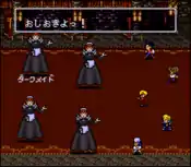 While players start out as incredibly incompetent in battle, they eventually start hitting the target monsters more frequently after leveling up. Players start out with an unusually high number of hit points but can easily die, although they have access to healing services.[9] Healing is done by eating food items at a restaurant, as opposed to sleeping at an inn. Players use items like bamboo sticks and basketballs as weapons against the enemies, which are fought in a manner similar to the Romancing SaGa video game series.[10]
