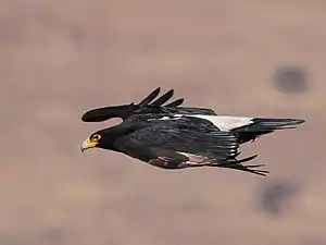 Verreaux's eagle (Aquila verreauxii) is a large, mostly African, bird of prey. It is also called the black eagle, especially in southern Africa, not to be confused with the Indian black eagle (Ictinaetus malayensis), which lives far to the east in Asia.[2] Verreaux's eagle lives in hilly and mountainous regions of southern and eastern Africa (extending marginally into Chad), and very locally in West Africa, the Arabian Peninsula and the southern Middle East. It is one of the most specialized species of accipitrid in the world, with its distribution and life history revolving around its favorite prey species, the rock hyraxes. When hyrax populations decline, the species have been shown to survive with mixed success on other prey, such as small antelopes, gamebirds, hares, monkeys and other assorted vertebrates. Despite a high degree of specialization, Verreaux's eagle has, from a conservation standpoint, been faring relatively well in historic times. One population of this species, in the Matobo Hills of Zimbabwe, is arguably the best studied eagle population in the world, having been subject to continuous detailed study since the late 1950s.[2][3] Like all eagles, this species belongs to the taxonomic order Accipitriformes (formerly included in Falconiformes) and the family Accipitridae, which may be referred to colloquially as accipitrids or raptors.