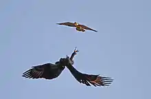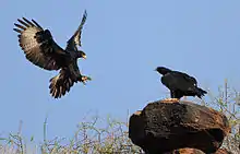 Although it is the most specialized predator of rock hyrax in the world, it does not have monopoly on this prey. Many wild predators are also attracted to rock hyraxes, which thus puts them in potential competition with the Verreaux's eagles. Amongst the other very large eagles which are widely found in sub-Saharan Africa, both the crowned eagle and the martial eagle may also locally favor rock hyraxes in their diets. However, these species have highly different habitat preferences and hunting techniques. The crowned eagle, a forest-dwelling species, is primarily a perch-hunter and can spend hours watching for prey activity from a prominent tree perch. The martial eagle is a dweller mainly of lightly wooded savanna and often hunts on the wing, soaring high and watching for prey activity with its superb vision, quite unlike the contour-hunting technique used by Verreaux's eagles. While the habitats of crowned and Verreaux's eagle keep them segregated enough to likely eliminate competition, confrontations between Verreaux's and martial eagles have been recorded. Although somewhat larger and more powerful, the martial eagle is relatively less nimble in the air and there is a case where a martial eagle was robbed of rock hyrax prey by a Verreaux's eagle.[15][24] Another case of kleptoparasitism by a Verreaux's eagle involved one stealing some carrion from a lammergeier (Gypaetus barbatus).[15] Verreaux's eagles occasionally prey on other large raptors including vultures, including white-headed vulture (Trigonoceps occipitalis), white-backed vulture (Gyps africanus) and Cape vulture (Gyps coprotheres), though the earlier cases probably refer to nestling or juvenile predation and the latter to nest defense on the part of the eagles.[50][65][75] An apparent predation attempt on a full grown juvenile Rüppell's griffon (Gyps rueppellii) was abortive.[76] A unique opportunity to study Verreaux's eagle living with its closest extant cousin, the golden eagle, has been afforded in the Bale Mountains of Ethiopia. The two species, with similar habitat preferences, were observed to defend their territories from one another exclusively, with many cases of goldens chasing Verreaux's eagles out of their respective territories in flight and only one of Verreaux's chasing the goldens. However, since the golden eagles prefer hares and Verreaux prefers rock hyraxes, they actually seem to have no deleterious effect on each other's breeding activities.[77] African hawk-eagles (Aquila spilogaster) may also take a few hyraxes, but are likely to avoid direct conflicts with their much larger cousins, so will tawny eagles (Aquila rapax).[24] Other predators of rock hyrax may include felids like African wildcats (Felis silvestris lybica), servals (Leptailurus serval), caracals (Caracal caracal) and leopards (Panthera pardus) as well as jackals (Canis ssp.), African rock pythons (Python sebae) and owls (mainly the large Verreaux's eagle-owl (Bubo lacteus) or possibly the Cape eagle-owl (B. capensis)). Neonate rock hyraxes may fall prey to mongooses and venomous snakes like Egyptian cobras (Naja haje) and puff adders (Bitis arietans).[78][79] Due to the formidable range of competitors it pays for Verreaux's eagle to be cautious from the moment it bears down on its prey. Cases where pirating has been attempted has involved diverse carnivores like caracals and jackals. In at least one case, a Verreaux's eagle was observed to be displaced off a rodent-kill (likely a cane-rat) by an Ethiopian wolf (Canis simensis).[80] Unlikely competitors for nest sites are known to have included baboons and even geese.[81][82] As is often the case with reintroduced eagles (i.e. seen even in the huge harpy eagle (Harpia harpyja)), reintroduced Verreaux's eagle may lose their fear of other predators to their own detriment and one such bird fell victim to a caracal.[83] Cases where Verreaux's eagles have swooped at leopards are not likely competitive but are more likely to try to displace the cat from their territory, and such attacks have occasionally had fatal results for the birds.[9][84] This species is not normally aggressive to humans but may swoop uncomfortably close when the nest is being investigated.[9]