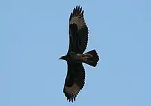 The Verreaux's eagle is essentially unmistakable, especially in adulthood. No other black-colored raptor in its range approaches this species’ large size, nor possesses its distinctive patterns of white.[15] The golden eagle is of similar size or marginally larger size and the two species are the heaviest living Aquila species and measure only marginally less than the slightly lighter-weight Australasian wedge-tailed eagle in total wing and bill-to-tail length.[3] While the juvenile Verreaux's eagle is quite different from the adult's, its plumage is no less distinctive. No other accipitrid shares the mottled brownish body, blackish wings with large white patches or contrasting whitish, rufous and golden color around the head and neck. The flight profile of Verreaux's eagle is also distinctive: it is the only Aquila species other than the golden eagle to soar in a pronounced dihedral, with the wings held slightly above the back and primaries upturned at the tip to make a V shape. In the Bale Mountains of Ethiopia and possibly in some parts of the Arabian Peninsula and the southwestern edge of the Middle East, the ranges of the golden and Verreaux's eagles overlap, but the golden is a mostly brown bird and shares none of the Verreaux's black plumage. The immature golden eagle has white patches on its underwing as do Verreaux's, but they are less extensive than those of the latter species. The wing shape also differs from the golden's, as the Verreaux's eagle has very broad outer secondaries and a relatively narrow pinch at the base of the primaries, whereas the tapering of a golden eagle's wing is more gradual. The Verreaux's eagle wings have variously been described as paddle, spoon or leaf shaped.[9][15] Imperial eagles too have white markings on their wing coverts, but are different in flight profile (flatter winged) and overall coloration (dark brown).[15]