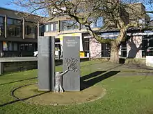 In September 2000, a memorial for the murdered Jewish population was set up in the middle of the town, very prominently, right in front of the town hall. It lists the names of the local victims of the Holocaust. Most prominent among them figures the family Spiegel. The design was developed by two students and their teacher from the local highschool.[4] The historian Reinhart Koselleck cited the difference in the naming of the murdered Jewish citizens and the anonymity of memory for the fallen soldiers and immediate victims of World War II by Kleinhans in Versmold as example of how the Germans deal with their recent history in the collective memory.[5]