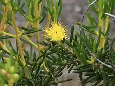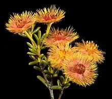 The flowers are usually scented, arranged in a corymb-like groups on the ends of the branches, bright yellow but ageing to bronze or brown, sometimes only in the centre. The flowers are held erect on stalks 4–18 mm (0.2–0.7 in) long. The floral cup is shaped like half a sphere about 1.5 mm (0.06 in) long, with 10 ribs, glabrous and slightly warty. The sepals are bright yellow, 4.0–4.5 mm (0.16–0.18 in) long, with 7 or 10 densely feathery lobes. The petals are also bright yellow, egg-shaped, 3.5–5.0 mm (0.14–0.20 in) and have long, spreading finger-like lobes. The style is 3.5–4 mm (0.14–0.16 in) long, straight or slightly curved. Flowering time is from September to December.[1][2]
