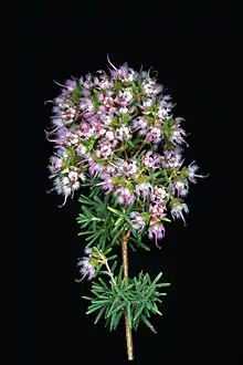 - Verticordia densiflora Lindl. var. densiflora which has leaves 0.8–1.2 mm (0.03–0.05 in) wide near the flowers, flower stalks less than 4 mm (0.2 in) long, corymb-like groups of pink or pink and cream-coloured flowers with sepals 2–2.2 mm (0.08–0.09 in) long and petals 0.8–1.0 mm (0.03–0.04 in) long;[2][5]